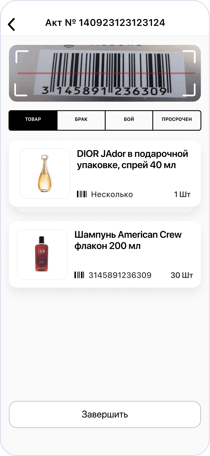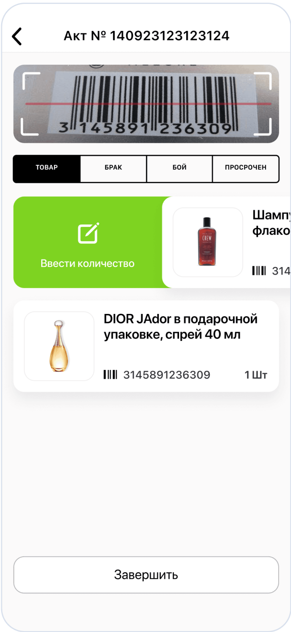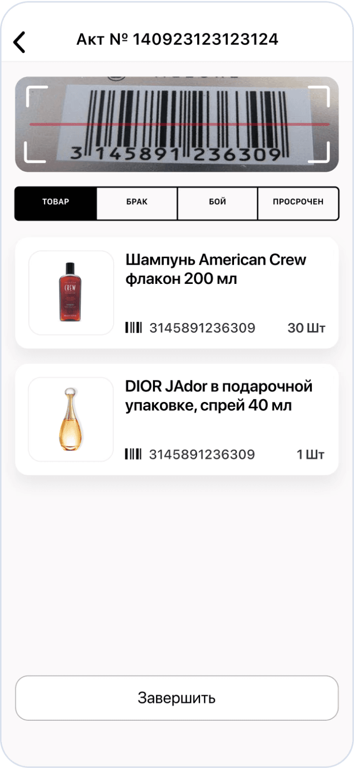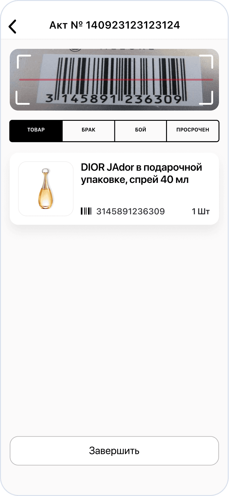 Сотрудник получает возможность управлять всем процессом на одном экране: выбирать состояние товара, сканировать и редактировать