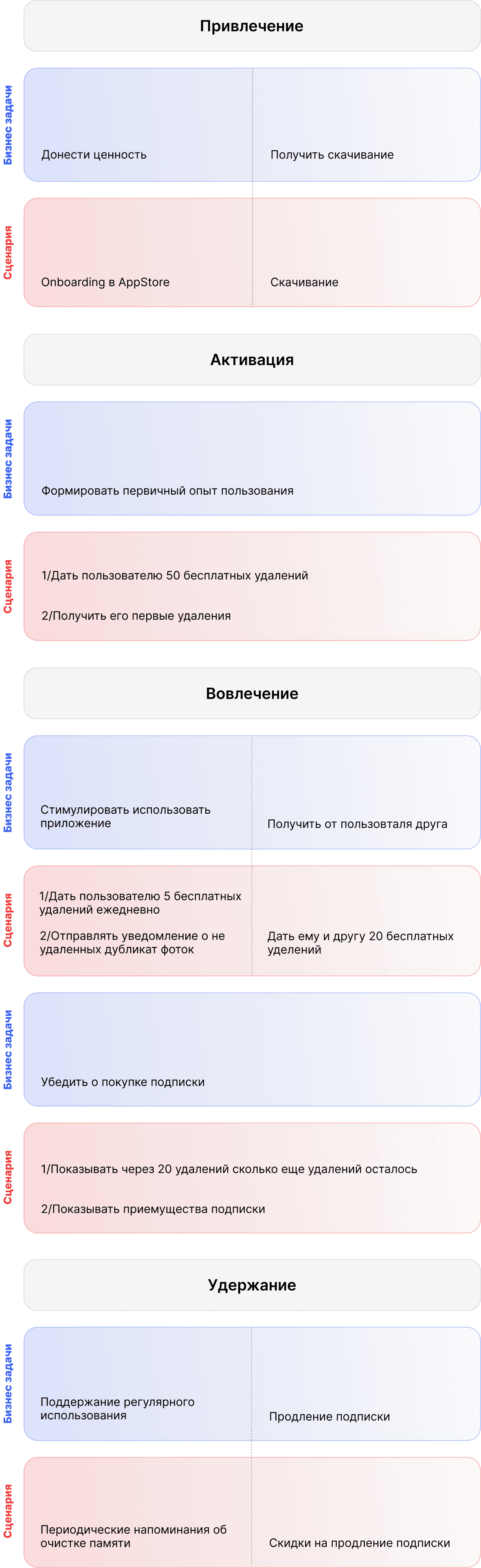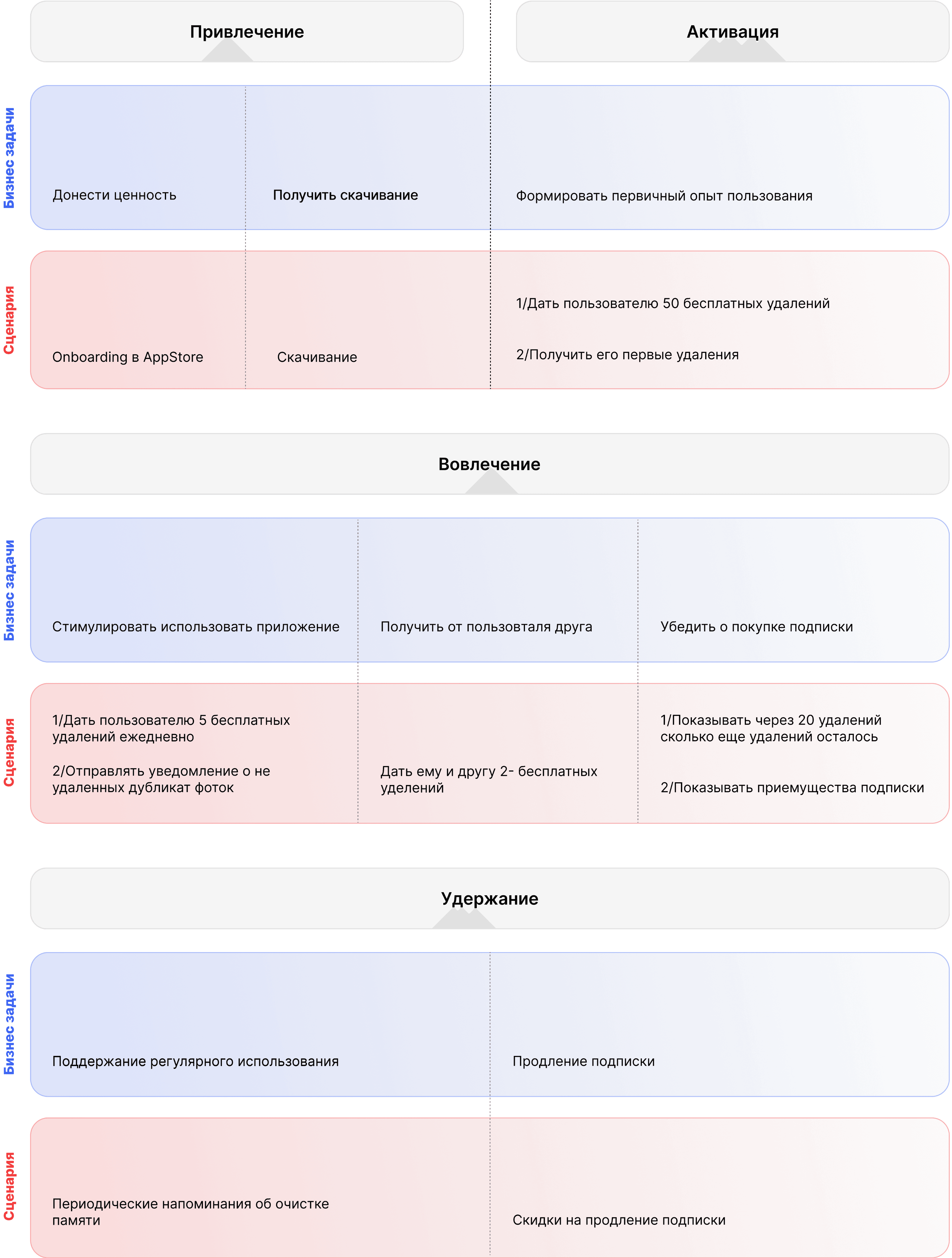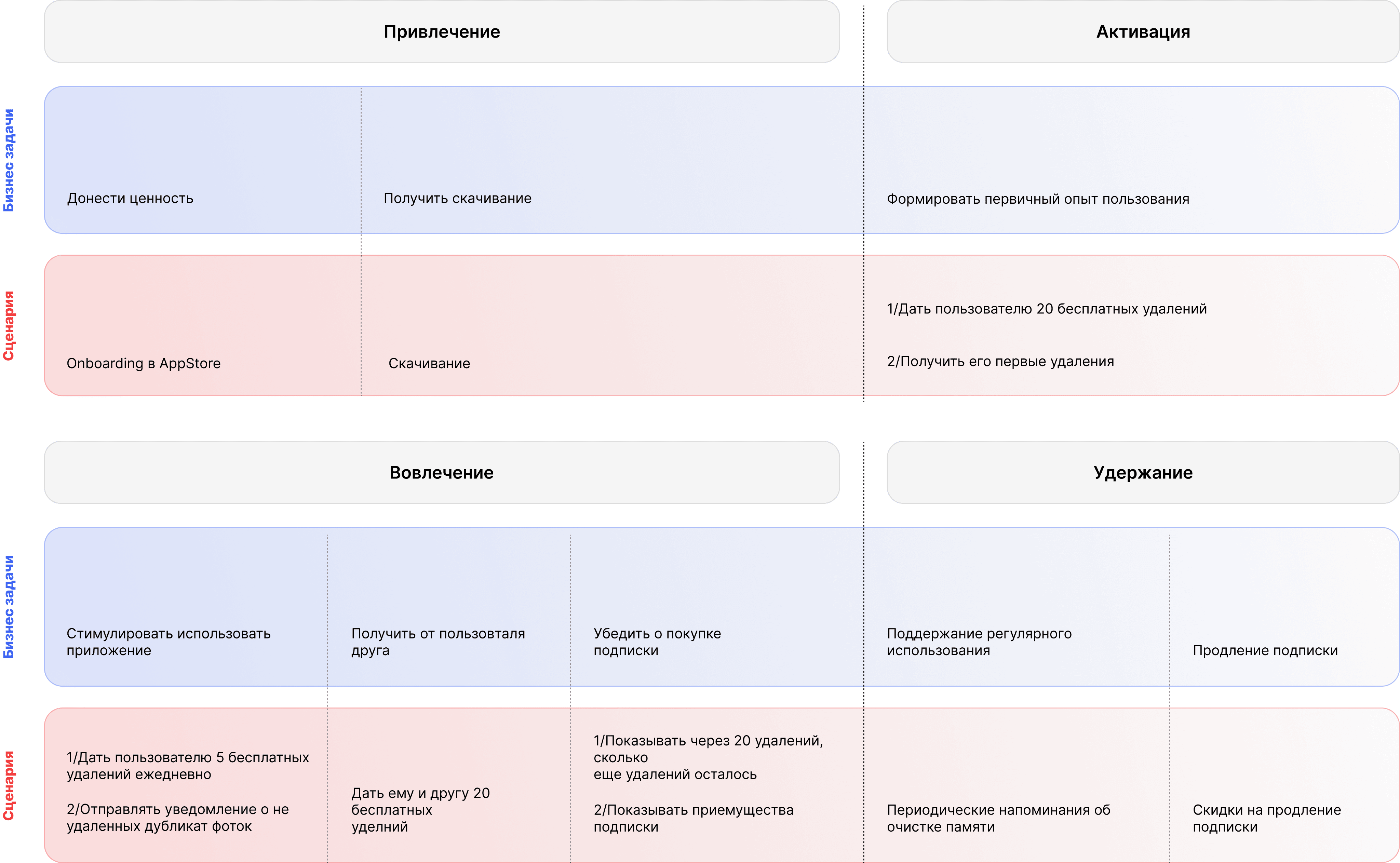 Далее была разработана 4-этапная карта пути клиента (CJM), включающая ключевые бизнес-задачи и сценария
